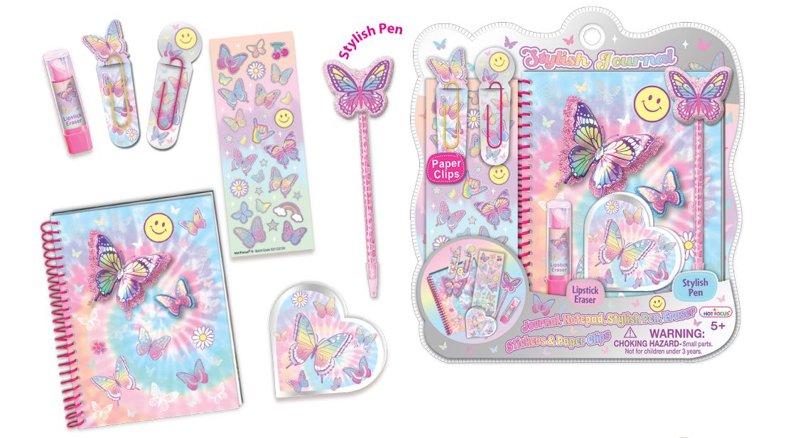 2 duże ozdobne spinacze, arkusz naklejek, długopis z ozdobną końcówką.